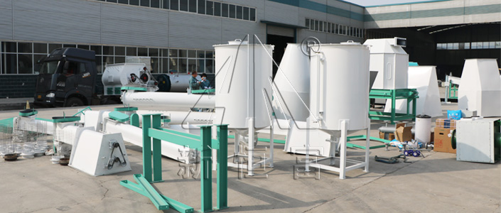 本次發往甘肅(sù)慶(qìng)陽的這套機組包含了鍘草機(jī),風機,鬥式提升機,SZLH420型環模顆(kē)粒機,雙軸槳葉(yè)式混合機,配料秤,逆流冷(lěng)卻器等。本(běn)機組包含了投料,粉碎(suì),混合,製粒,冷卻,包裝等工序。其中大大小小的設備足(zú)有幾十件之多,足足擺滿了(le)整個廠(chǎng)區廣場!