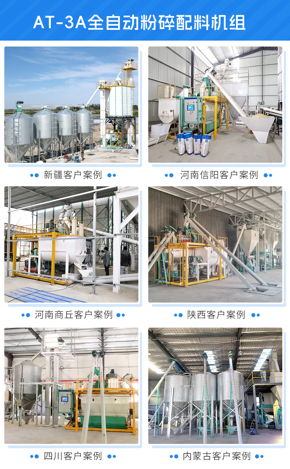 商討後決定:前端少量精(jīng)料部分(fèn)使用高效粉碎機;中間配套(tào)多個輔料倉(cāng),儲存預混料、石粉、麩皮;後端搭配一套AT-3A全自動粉碎配料機組(zǔ),集中稱重-配(pèi)料-注油-混合(hé)-放料。且經改良後,機組(zǔ)產量可達6-8噸/時。