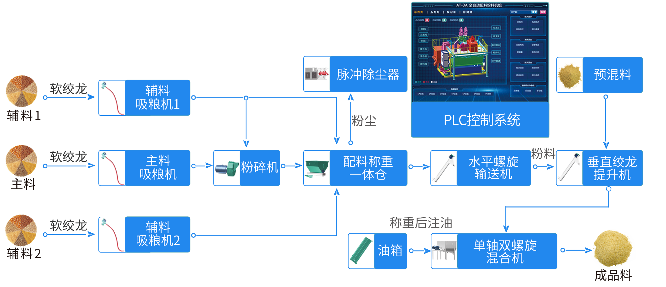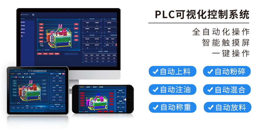PLC可視化(huà)控(kòng)製係統,電腦 / 平板(bǎn) / 手機全自動化智能觸摸屏一鍵操作(zuò);自動上料、自動粉(fěn)碎、自動稱重、自動注油(yóu)、自(zì)動混合、自動放料。