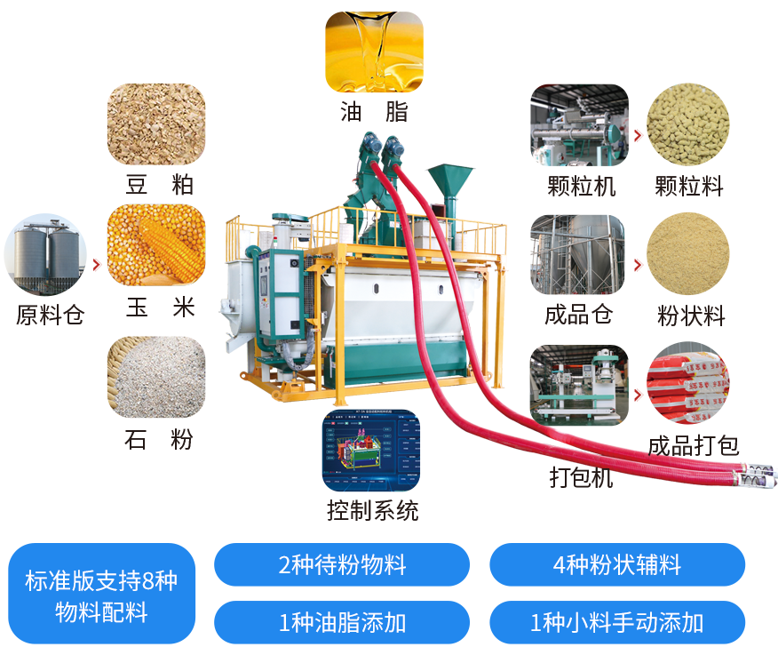 該搭配方式適用於各種規格的大、中型飼料廠和養殖場(chǎng)使用。配製而成的飼料成份含量均勻、不需要特殊場地就能連續作業,還可以加工預混料,混合料,濃縮料,全粉飼料(liào)等。