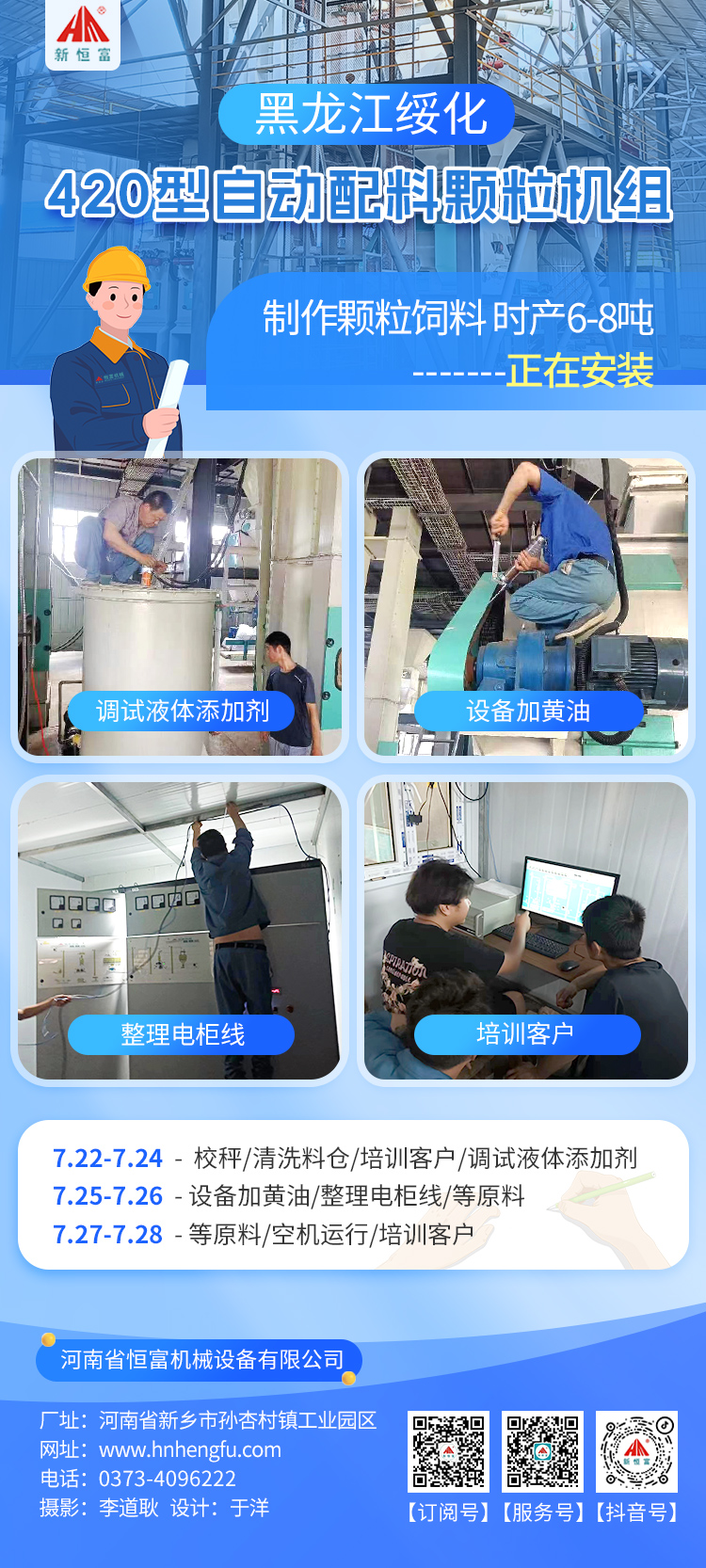 正在安裝的設備:黑龍江綏化420自動配料顆粒飼料機組、四川雅安250型(xíng)顆粒飼料機組。