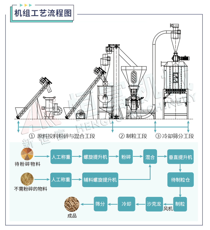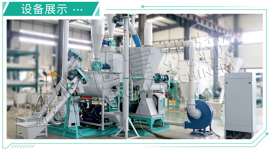 主要(yào)設備有:多功(gōng)能粉碎機(jī)、單(dān)軸雙螺旋混合機、250環模顆粒機、逆(nì)流冷卻器及掛篩(shāi)、除塵和輸送設備、附屬設備、電控係(xì)統等。