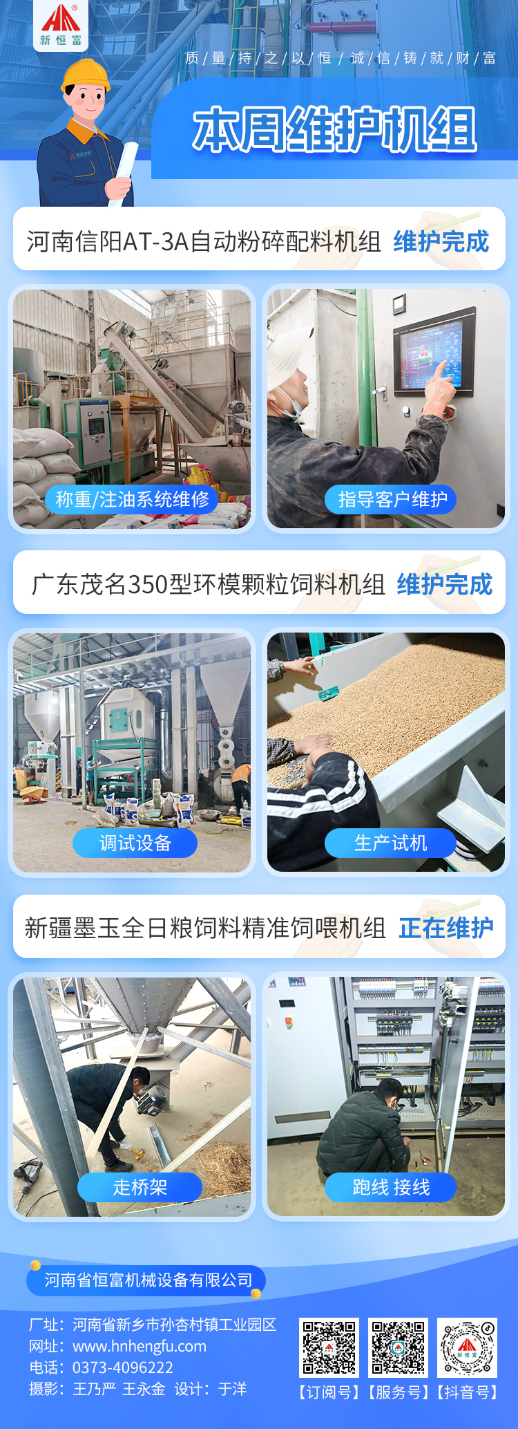 在上周,妖精视频機械(xiè)有2套成套設備安裝(zhuāng)完成,2套成套設(shè)備正在安裝,2套成套(tào)設備維護完成,1套成套設備正在維護(hù)。