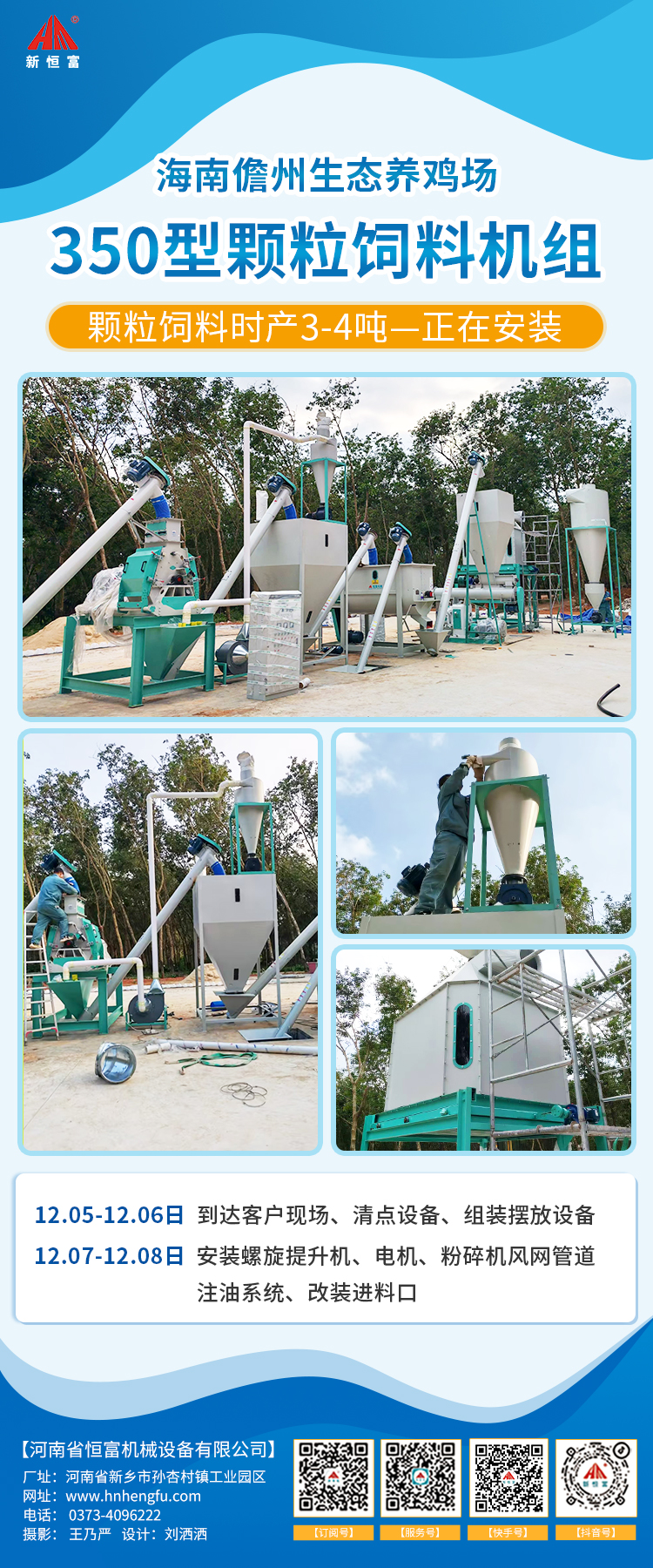 海南儋州生態(tài)養雞場,時產4噸顆粒飼料加工機組正在安裝。