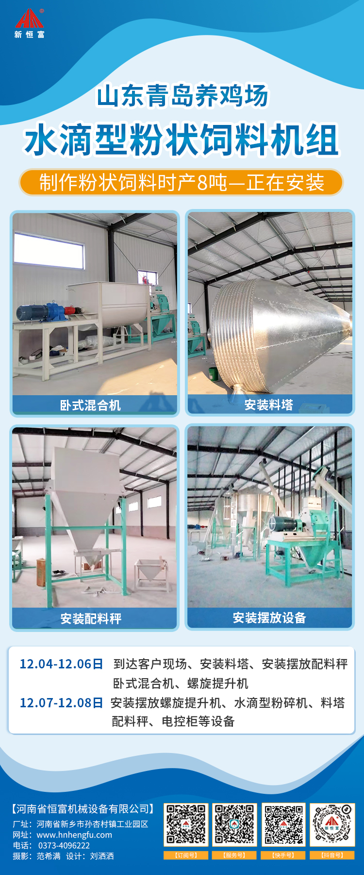 山東青島蛋雞養殖場,時產8噸(dūn)粉狀飼料加工機組正在安裝。