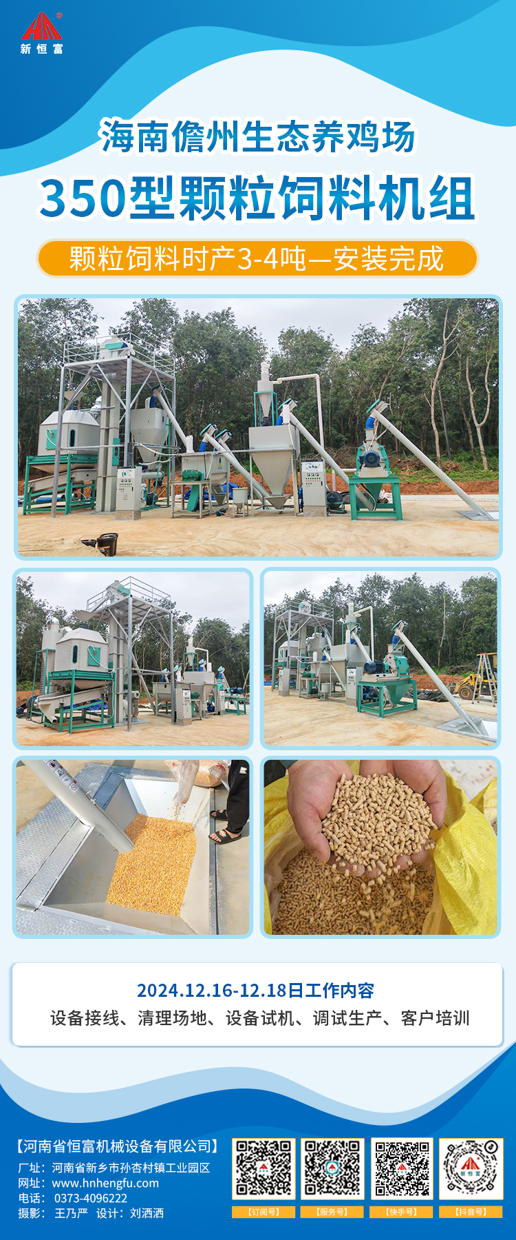 海南儋(dān)州生態養雞場,時產4噸(dūn)顆粒飼料加(jiā)工(gōng)機組安裝完成。