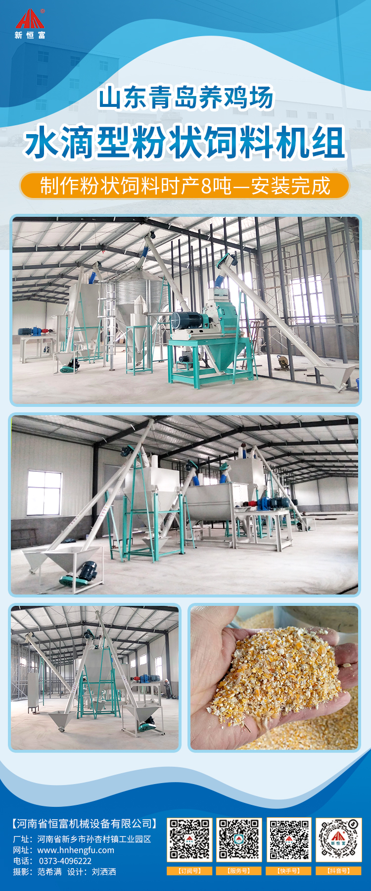山東青島蛋雞養殖場,時產8噸粉狀飼料加工機組安裝完成。