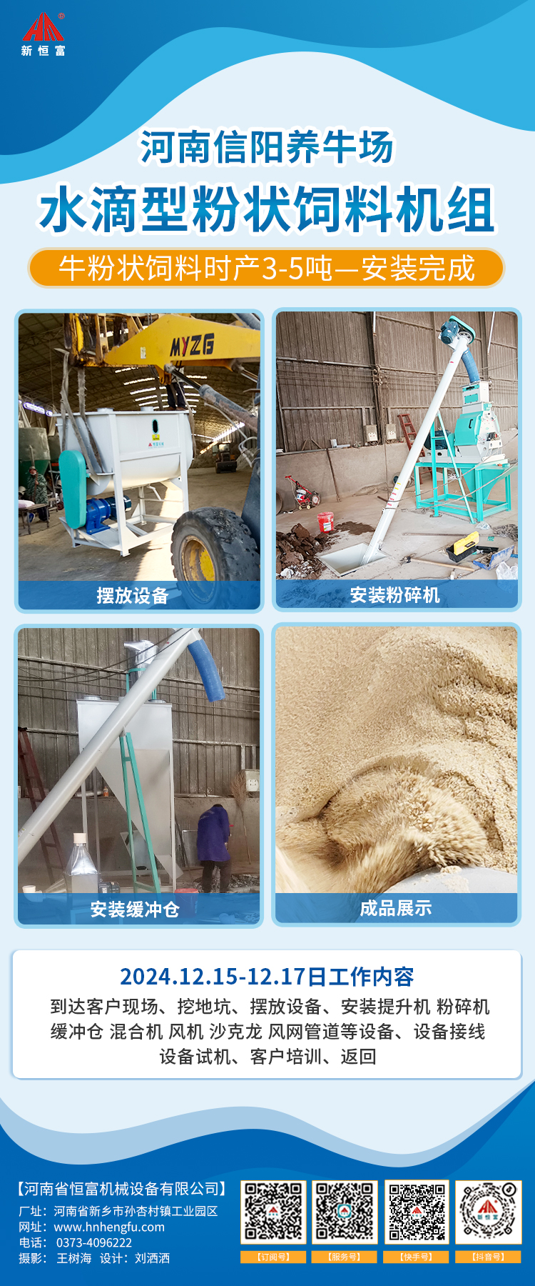 河南信陽養牛場,時產3-5噸水滴型粉狀飼料加工機組安裝完成。