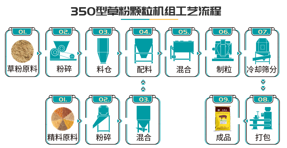 本套生產(chǎn)線主要以80%幹草和20%精糧為原料製作草(cǎo)粉顆粒飼料。搭配主要設備有:多功能飼料粉碎機(jī)、自吸式粉碎混合一體機、飼料配料秤、臥式單軸雙螺帶飼料混合機、環模飼料顆粒機、逆流式飼料(liào)冷卻器、飼料振動篩以及飼料定量(liàng)包裝機等,該機組即可製作精料顆粒飼料也可製作草粉(fěn)顆粒(lì)飼(sì)料,且自動化程度(dù)高,可大大降低人工成(chéng)本。