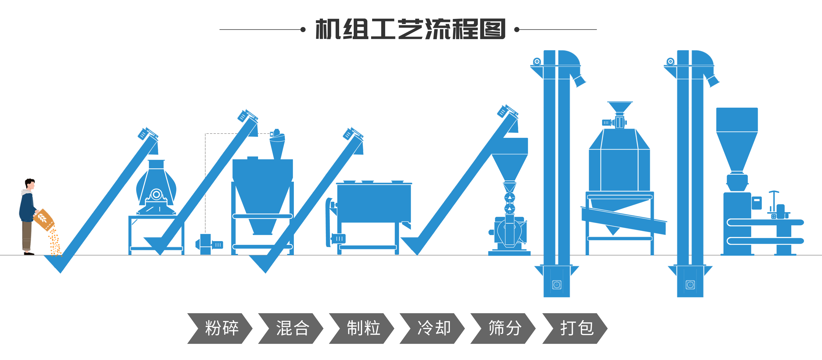 該機(jī)組主要是做豬顆粒飼料。搭配主要設備有(yǒu):水滴型飼料粉碎機、臥式單軸雙螺帶飼(sì)料混合機、環模飼料顆粒機、逆(nì)流式(shì)飼料冷卻器、飼料振動篩以及飼(sì)料定量包裝機等。本套設備適應範圍廣,可做家禽家(jiā)畜、水產等顆粒飼料。適合大、中型飼料廠、養殖廠使用(yòng)。