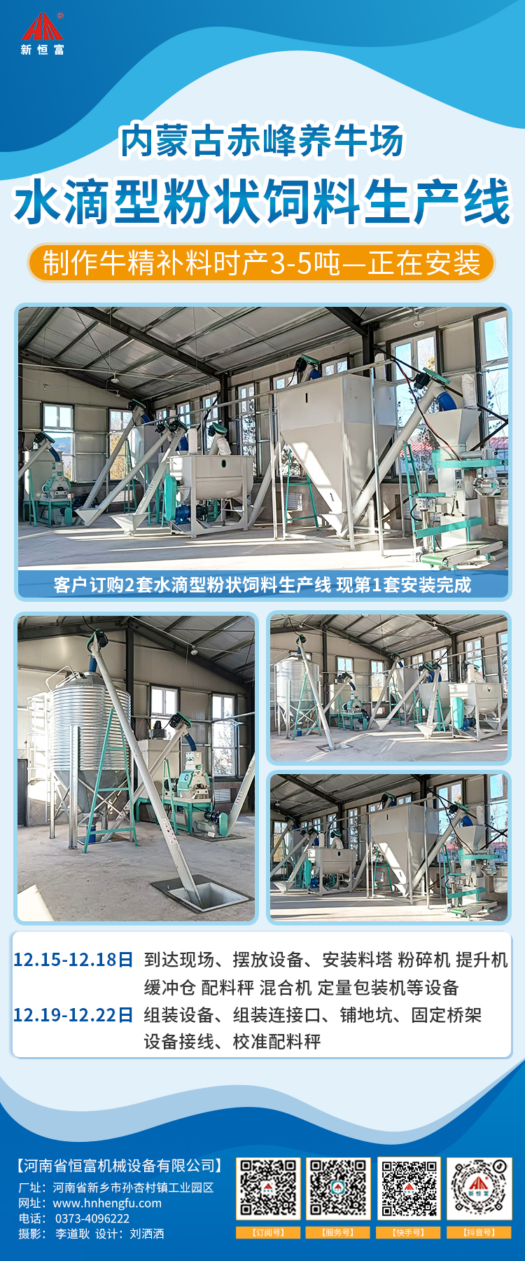 內蒙古赤峰養牛場,時產3-5噸粉狀飼料加工機組正在安裝。