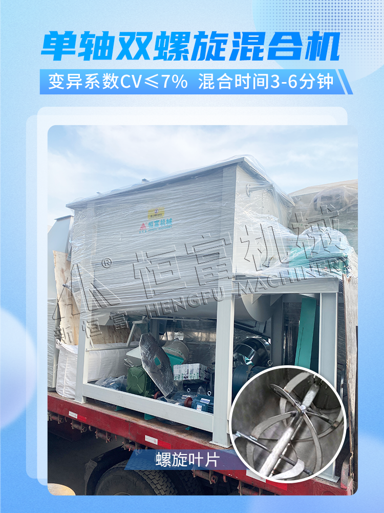 臥式單軸雙螺帶飼料混合(hé)機混合均勻度(dù)高,變異係數CV≤7%。結構簡單合理,維修方(fāng)便,適(shì)用於大、中、小型養殖場和飼(sì)料加(jiā)工廠以及幹粉混合行業使用。