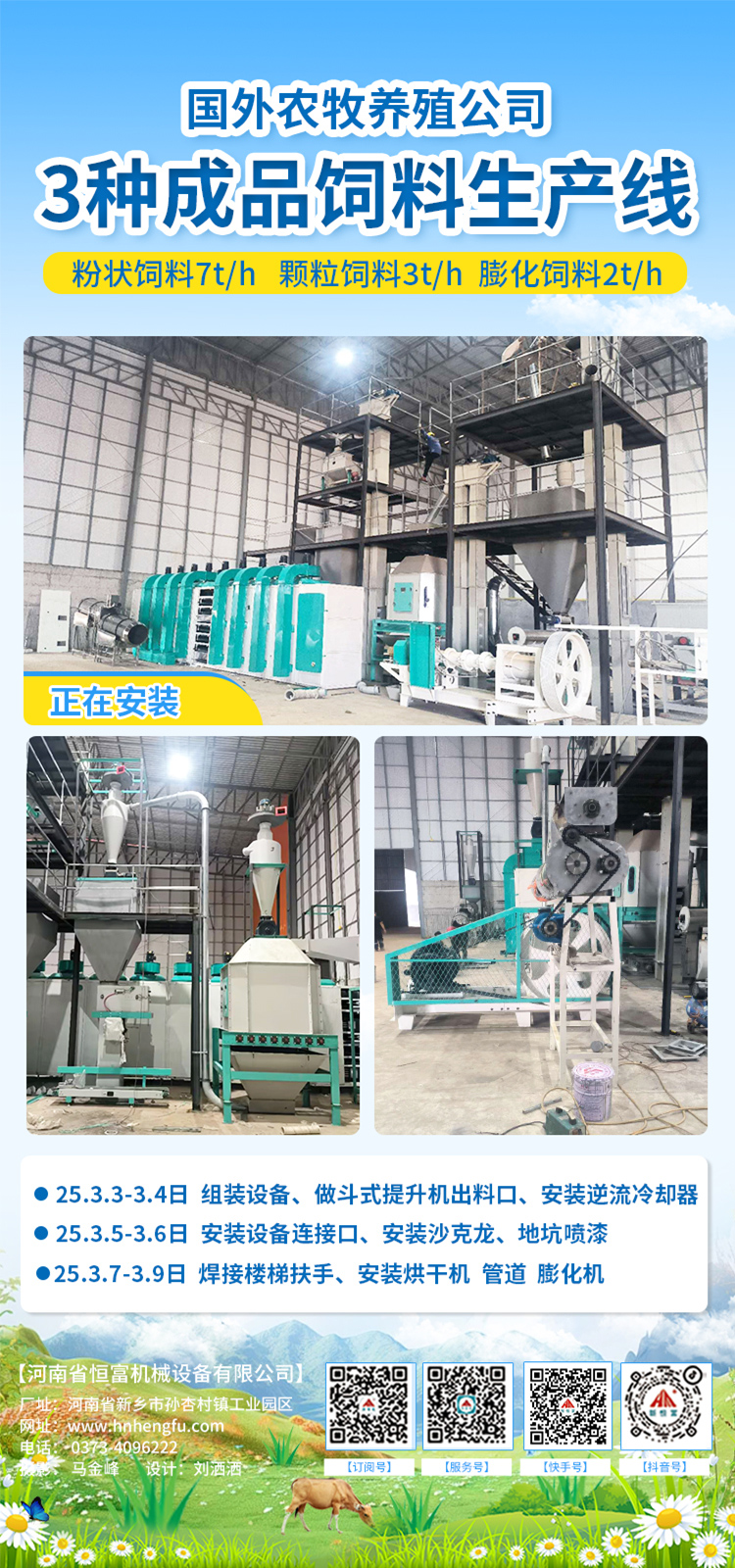 國外(wài)現代農業股份有限公司,時產2-7噸3種成品飼料生產線正(zhèng)在安裝。
