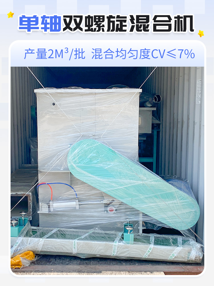 單軸雙螺旋混合(hé)機:9HWP1000型,容量2m³,功率15kw,混合均勻度cv≤7%。混合機的轉子(zǐ)是由兩個推(tuī)動(dòng)方(fāng)向相反的帶(dài)式螺旋組成,其攪拌能力強,攪拌物料所需時間短,3-6min/p。可用(yòng)於混合按比例計量後的各種粉料(liào),預混料和全價料,適用於大、中、小型畜牧場、飼料(liào)加工廠。