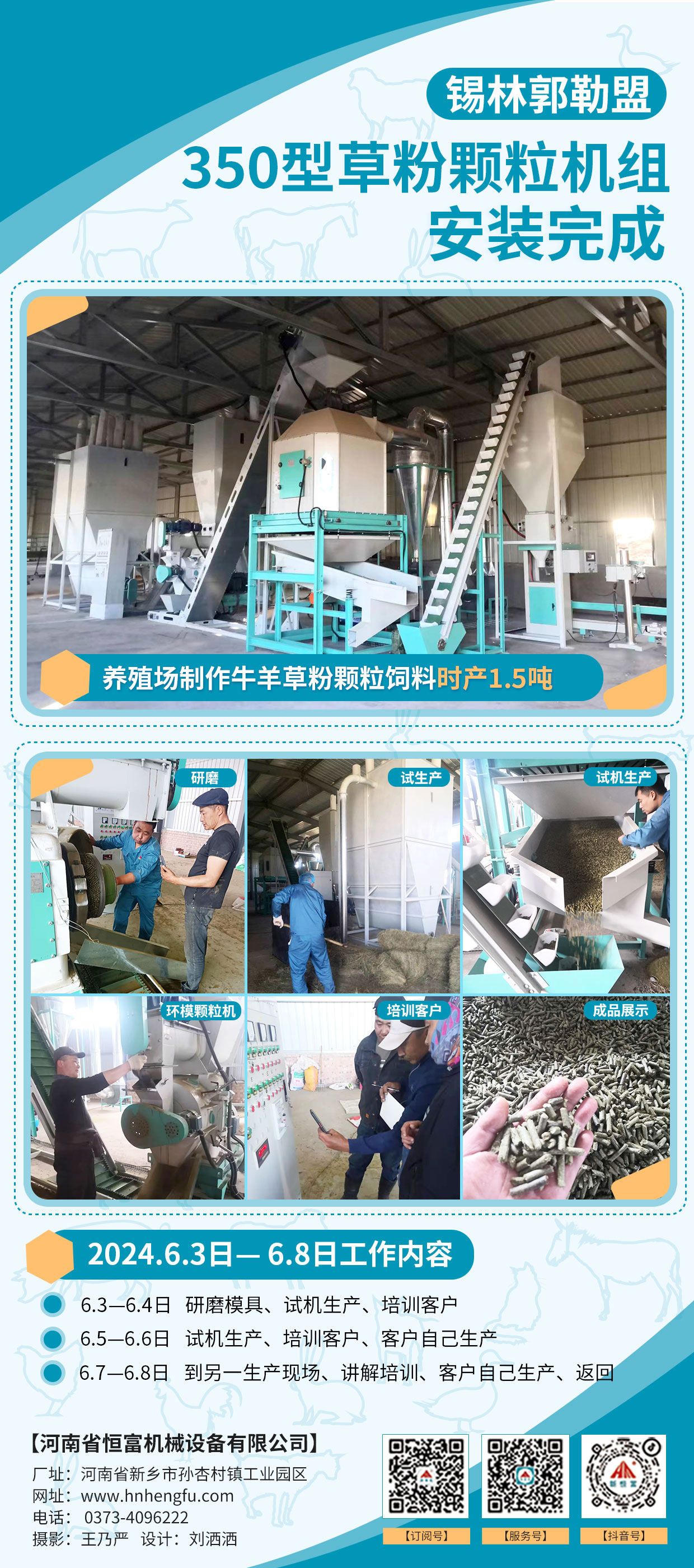 安(ān)裝完成的設備:內蒙古錫林(lín)郭(guō)勒(lè)盟350型草粉顆(kē)粒飼料機組(zǔ)、河南南陽56*40水滴(dī)型(xíng)臥式粉狀飼料機組、河北張家口簡易型粉狀飼料生產(chǎn)線。