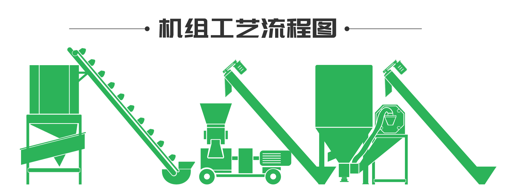 采用一體式飼料(liào)機粉碎混合物料;經螺旋提升機提升至300型平模顆粒機製粒後;由刮鬥輸(shū)送機輸送到1m³冷卻器進(jìn)行降溫除(chú)濕;物料經振動掛篩,篩出粉料和成形不好的顆粒重新製粒,從而提升成品(pǐn)顆粒飼料的品質;最後人工包裝(zhuāng)或者(zhě)搭配小推車直接飼喂。
