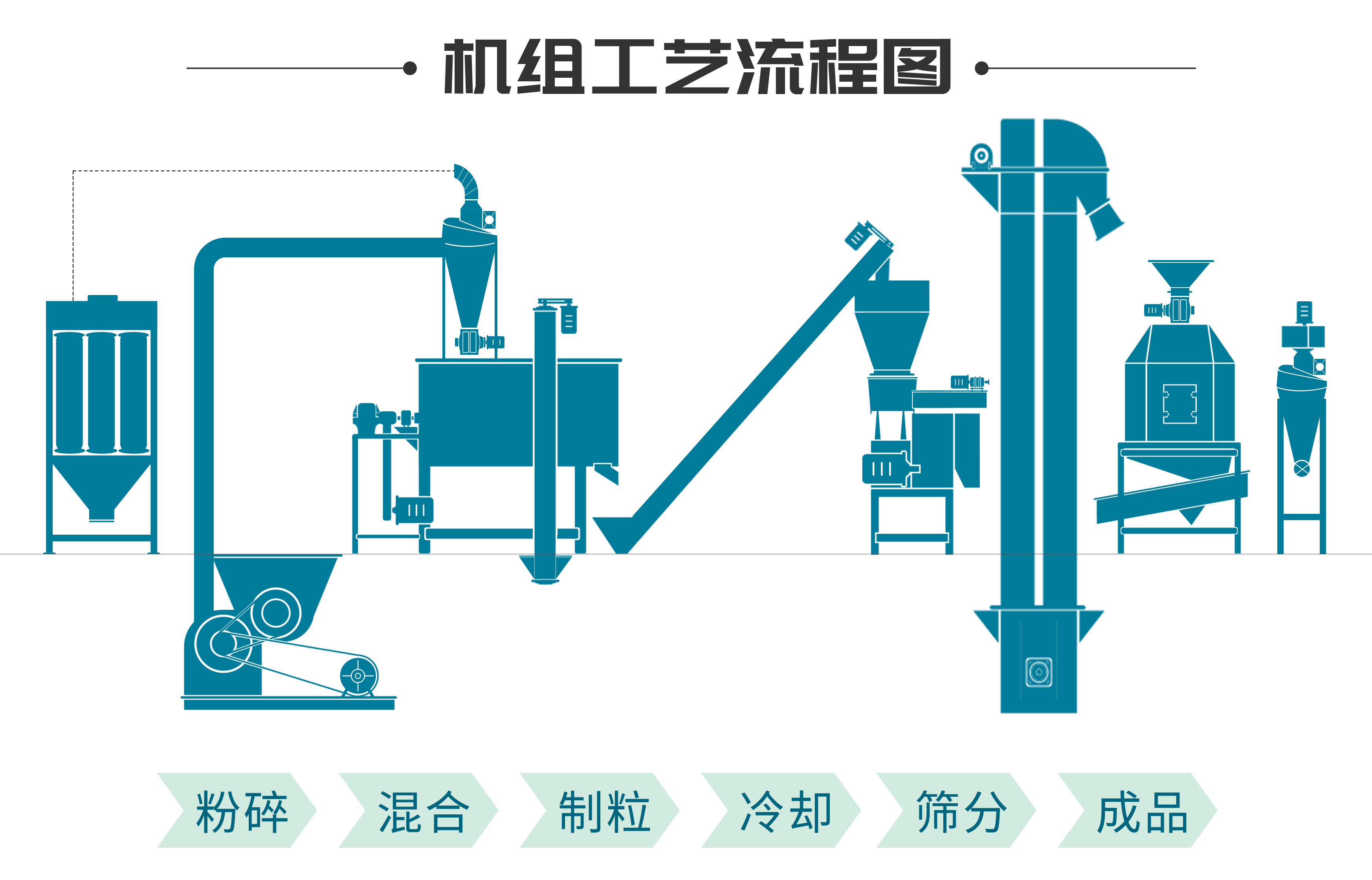 該生產線(xiàn)可自動完成粉碎、混合、製粒、冷卻、篩分等工作。是中小型家禽養(yǎng)殖場、小型飼料廠的理想草粉顆粒飼料加工機組。