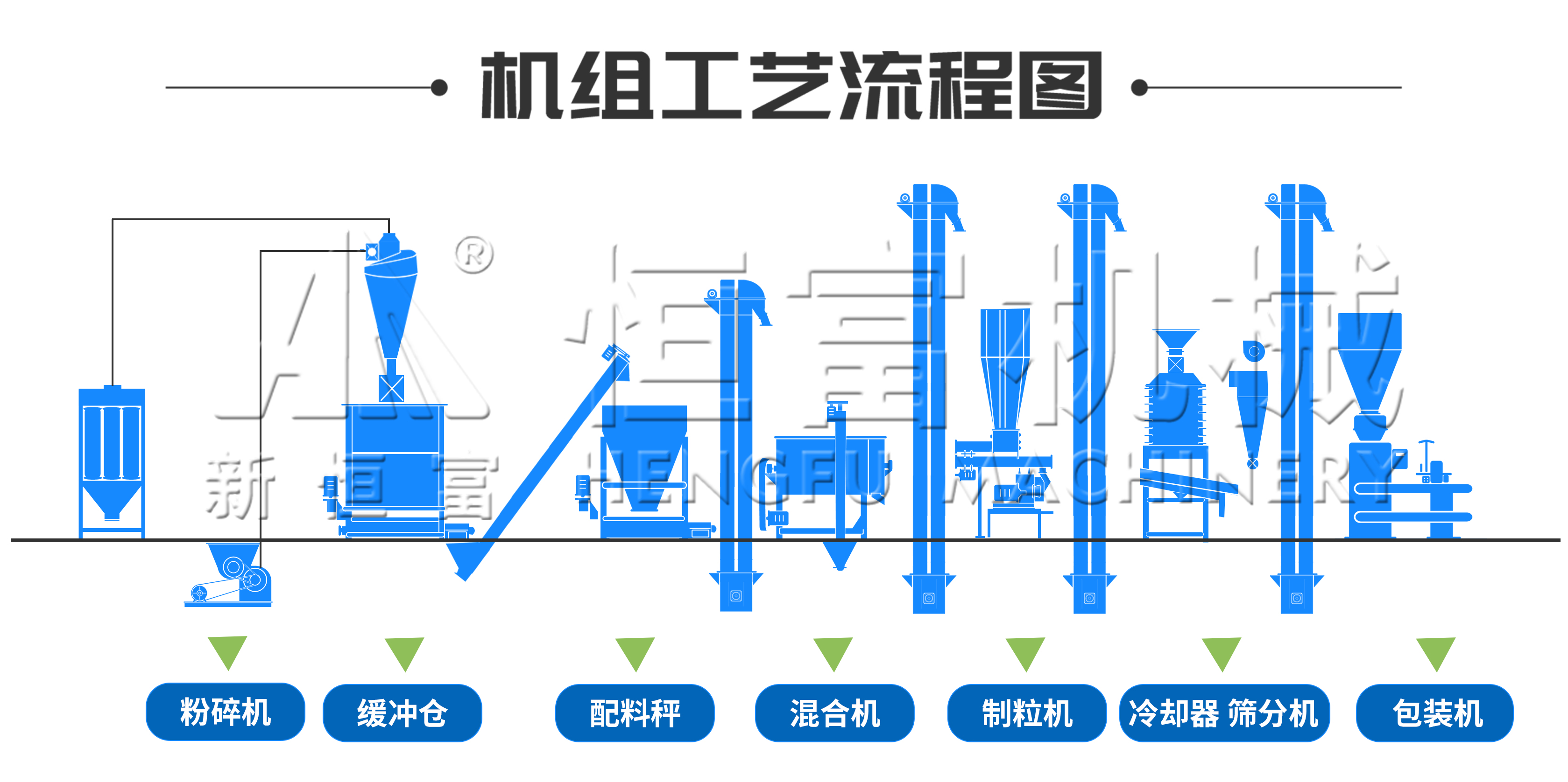 該生產線主要設備有多功能粉碎機、布袋(dài)除塵器、配料秤、單(dān)軸螺帶混(hún)合機、環模顆粒機、冷卻器(qì)及掛篩、定量(liàng)包裝秤、提升輸送設備、電(diàn)控係統等。