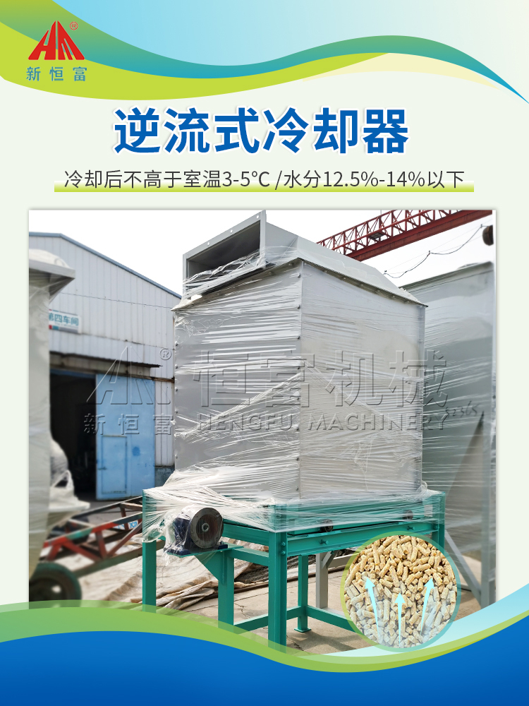 逆流式冷卻器,通常安(ān)裝在成套飼料機組的製粒機和包裝(zhuāng)機之間(jiān),主要是利用物流與氣流的相對運動來把(bǎ)高(gāo)溫(wēn)度、高濕度的顆粒飼料進行烘幹和冷卻,使其成為(wéi)可以直接飼喂和包裝的成品飼料。