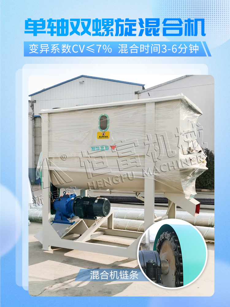 單軸雙螺旋混合機混合物料時具有高速,高效的(de)特點,其占地小,運行穩,速度(dù)快(kuài),均勻度高等優勢,已經(jīng)成為(wéi)飼料工廠的主要混合設備之一。