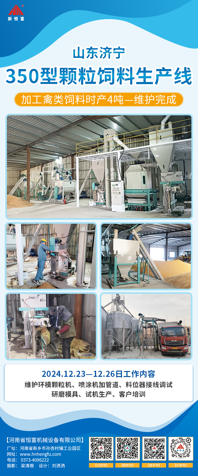 山東濟寧350型顆粒飼料生產線維(wéi)護完(wán)成,製作鴨(yā)顆粒飼料時產4噸。