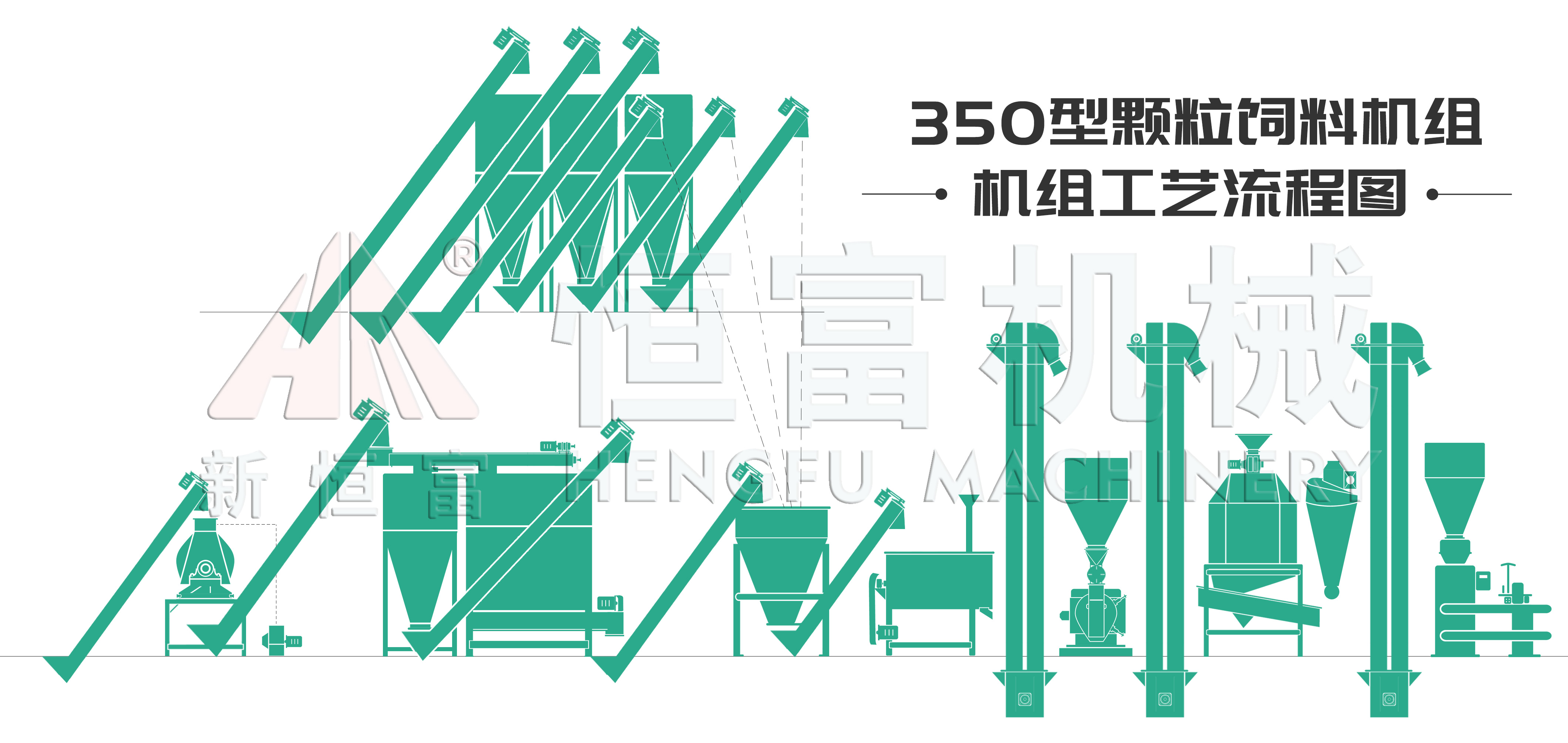 該設備前端是共用一套飼料配(pèi)料秤、水滴(dī)型飼料粉碎機、飼料緩(huǎn)衝(chōng)倉、臥式單軸雙螺帶飼料混合機,製作出來的成品粉狀飼料直接進入自動定量飼料包裝機進行打包;顆(kē)粒飼料生產線中間搭配有環模飼料顆粒機、逆流式飼料冷卻器、對輥式飼料破碎機,後端搭配了飼料振動篩以及自動定量飼料(liào)包裝機;膨化飼料生產線中間搭配有飼(sì)料膨化(huà)機、飼(sì)料烘幹機(jī),後端搭配了飼料噴塗機、飼料冷卻器以及自動定量飼料包裝機。