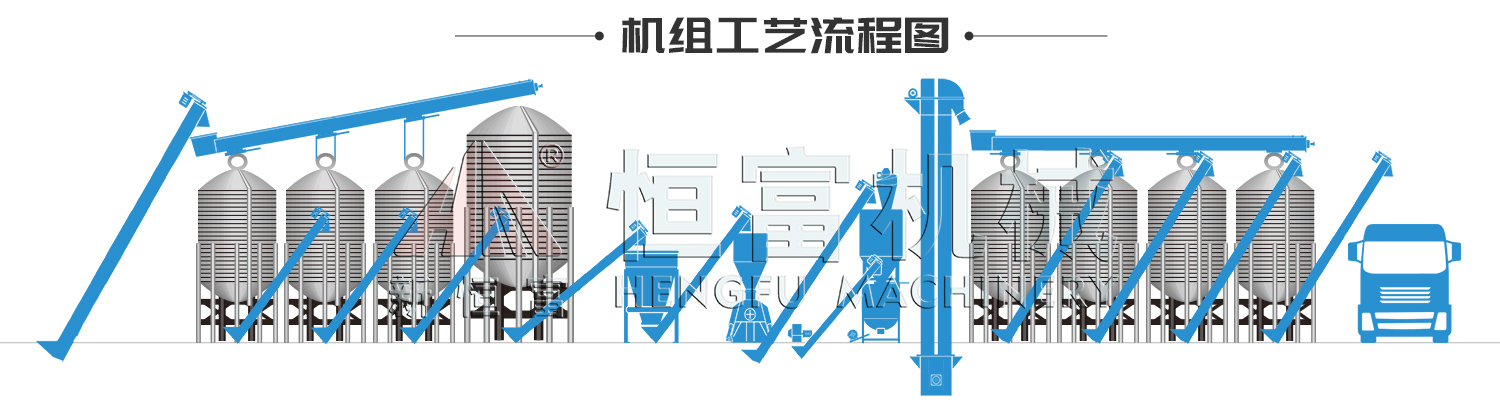 前端搭(dā)配4個原料塔,分別儲存玉米、小麥、豆粕、麩皮;把需要粉(fěn)碎的(de)物料先(xiān)進行稱(chēng)重和搭配,然後一起進水滴型飼料粉碎(suì)機進行粉碎,之後再進單軸螺帶(dài)飼(sì)料混合機進行混合,混合完成的飼料進料塔暫存,後續連接撒料車,直接進行飼喂。