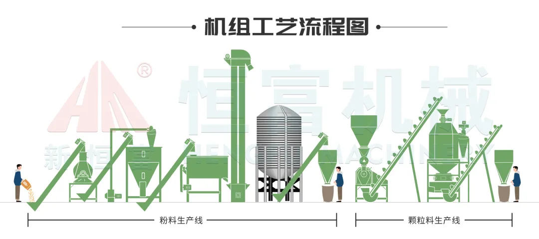 粉料+顆粒生產線:水滴式飼料粉碎機、緩衝倉、單軸雙螺旋飼料混合機、鍍鋅料塔、環模(mó)顆(kē)粒機、翻板逆流冷卻器(qì)、破碎機以及(jí)各種輸送設(shè)備等。